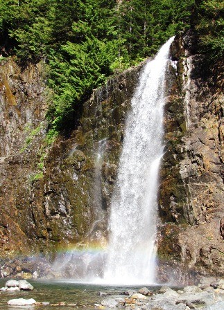 Waterfall with a rainbow at the base of it.