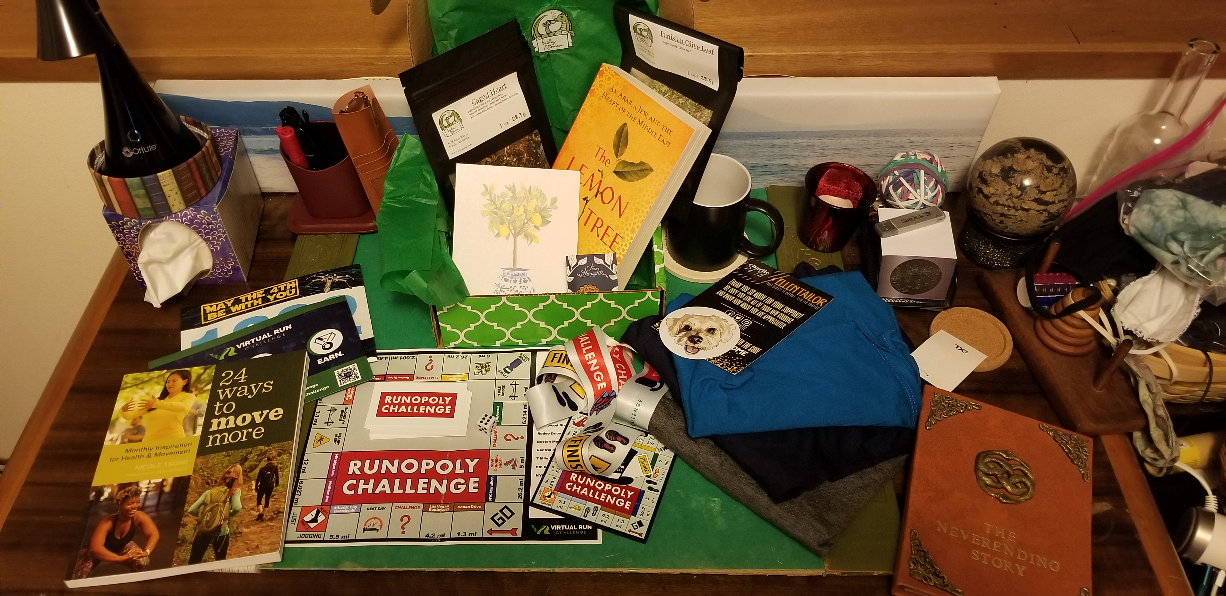 Thankfully, have some fun shirts from CharliePete (Mask-Up short-sleeved tees), “24 Ways to Move More” by Nicole Tsong, “The Book CommuniTea” by Friday Afternoon Tea and a few new e-books downloaded.